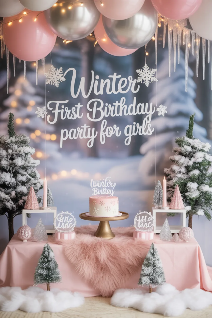 I consider this the most dependable winter birthday theme because it works across different budgets and spaces. The idea is to build a soft snow-inspired environment using whites, silvers, and light blue accents.